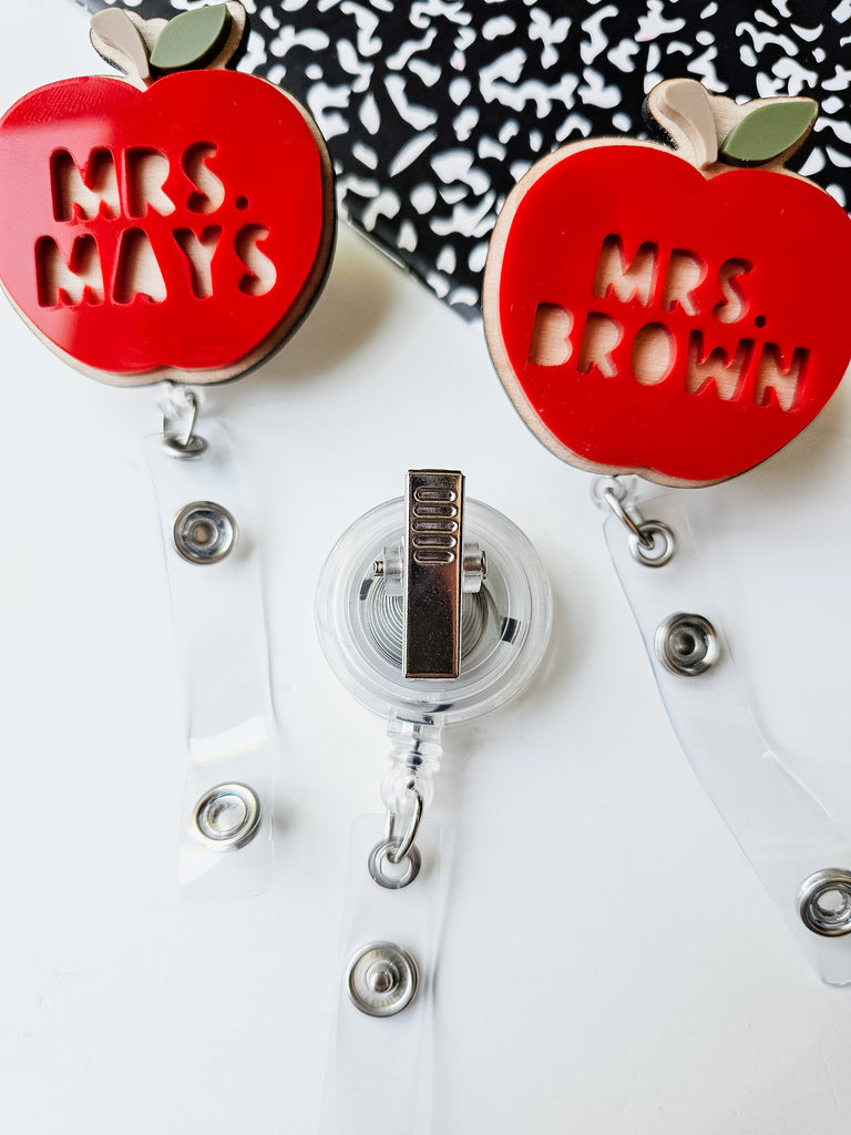 These laser cut badge reels have a 360 alligator clip on the back with a double layered laser cut personalized apple name that is adhered to the front.Ā
