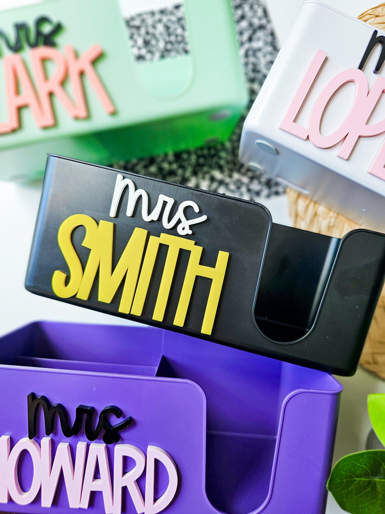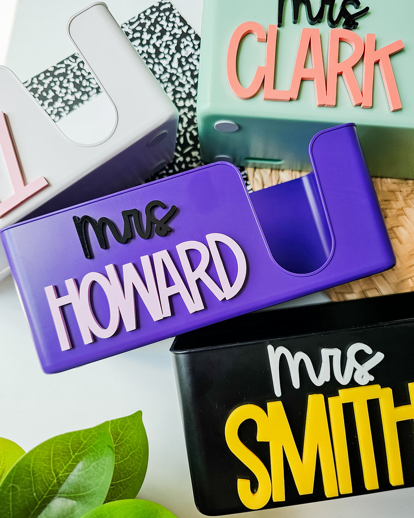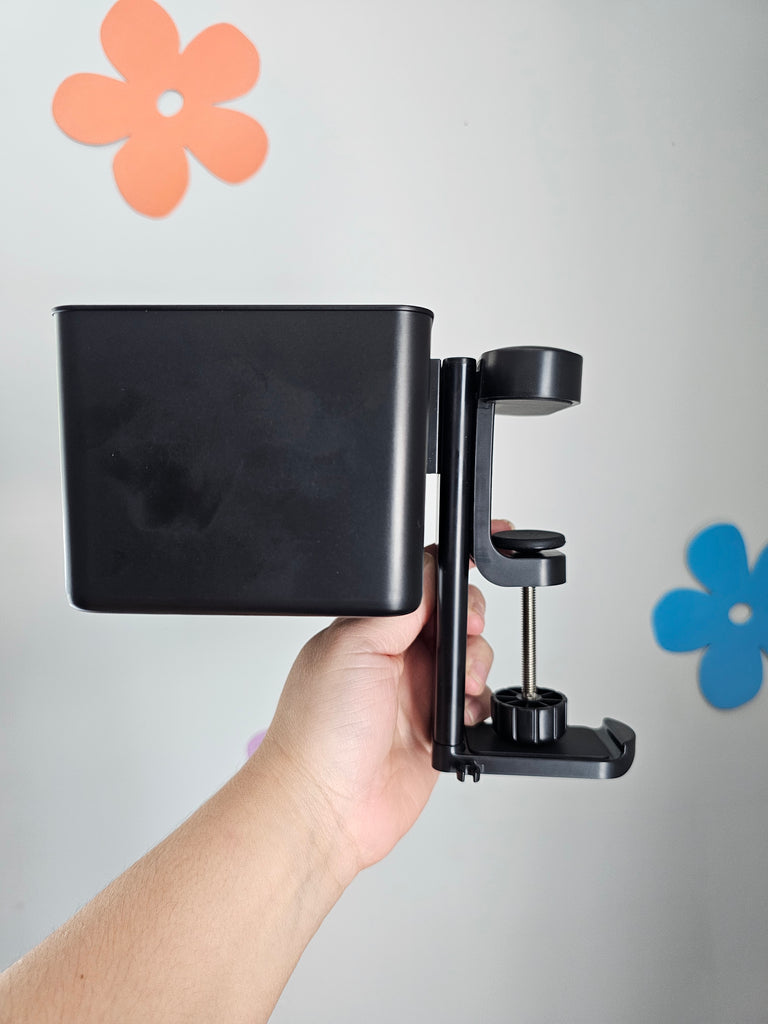 These personalized cup, pen, scissors, phone organizer clamp to the side of your rolling desk so you don't have to worry about your drink or writing utensils falling!