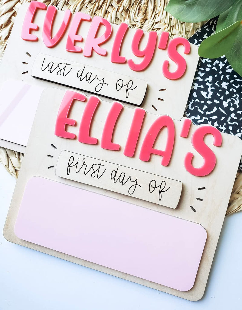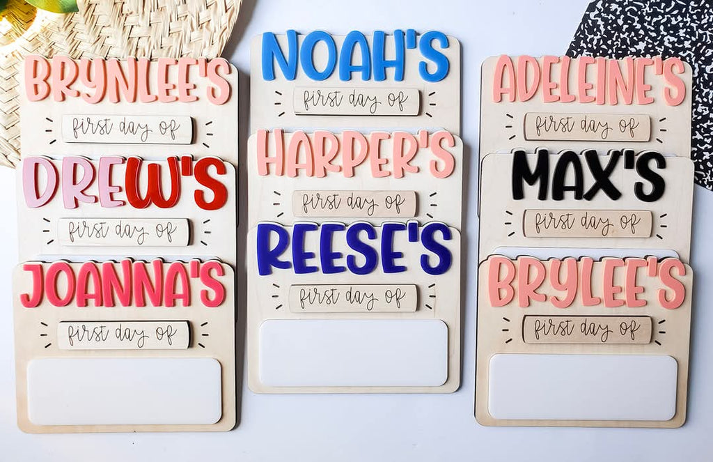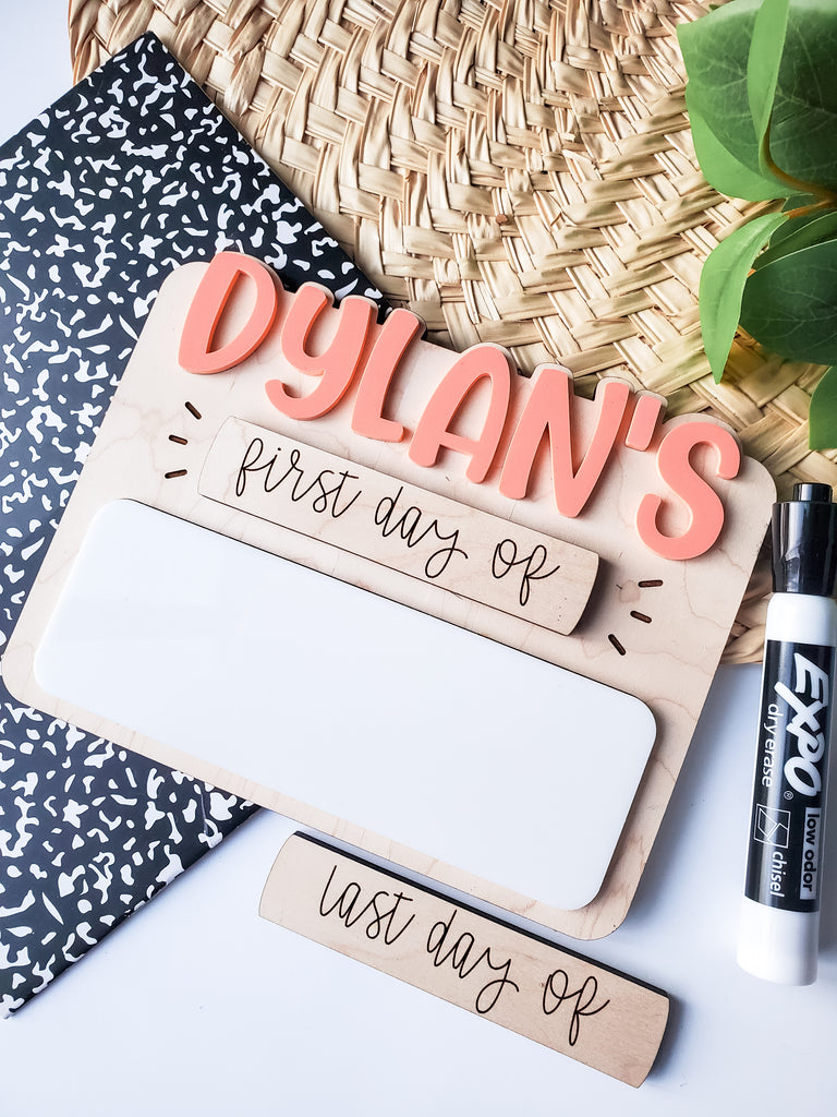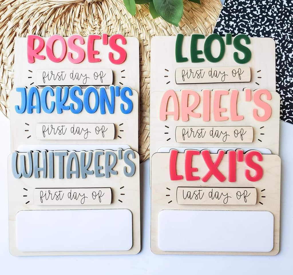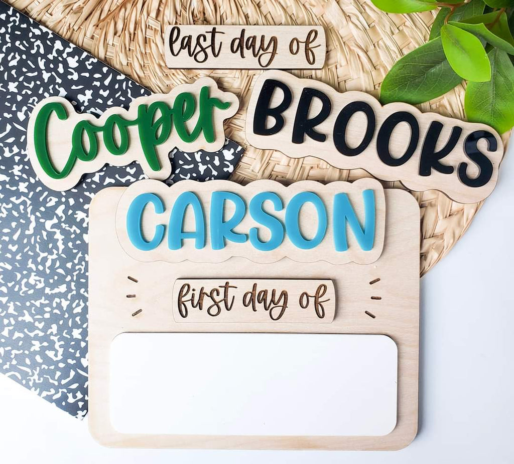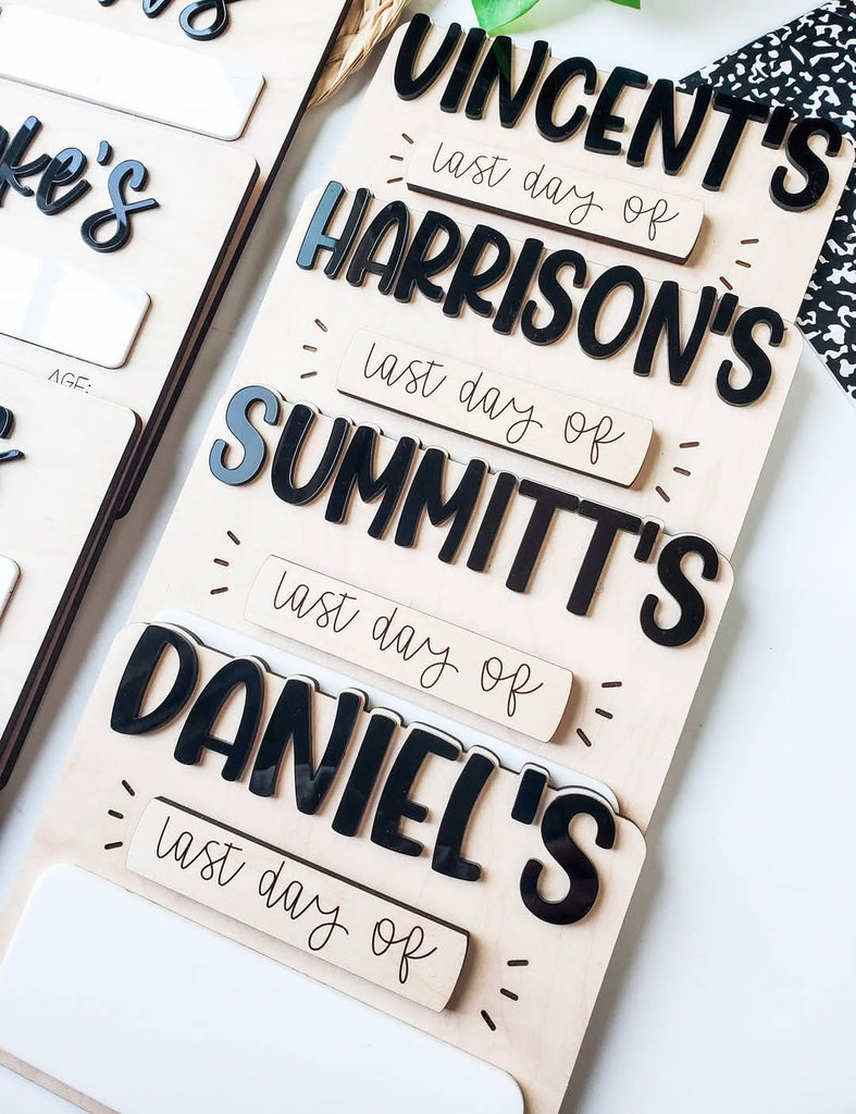 Made up of maple wood with 3d acrylic accents for name and interchangeable pieces for first and last day.