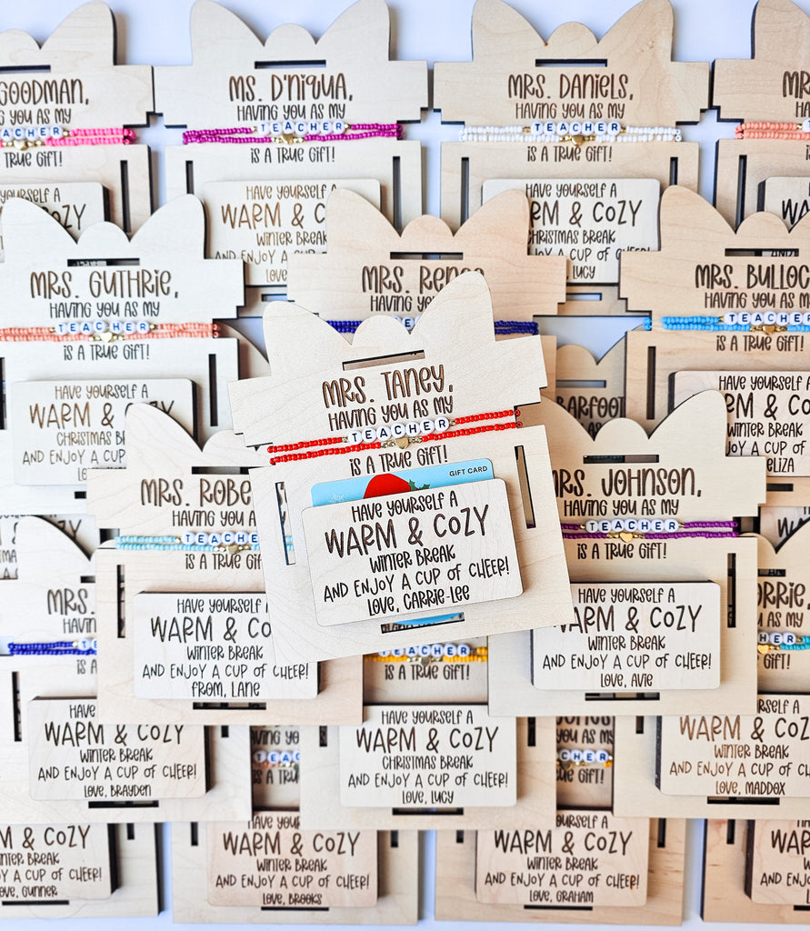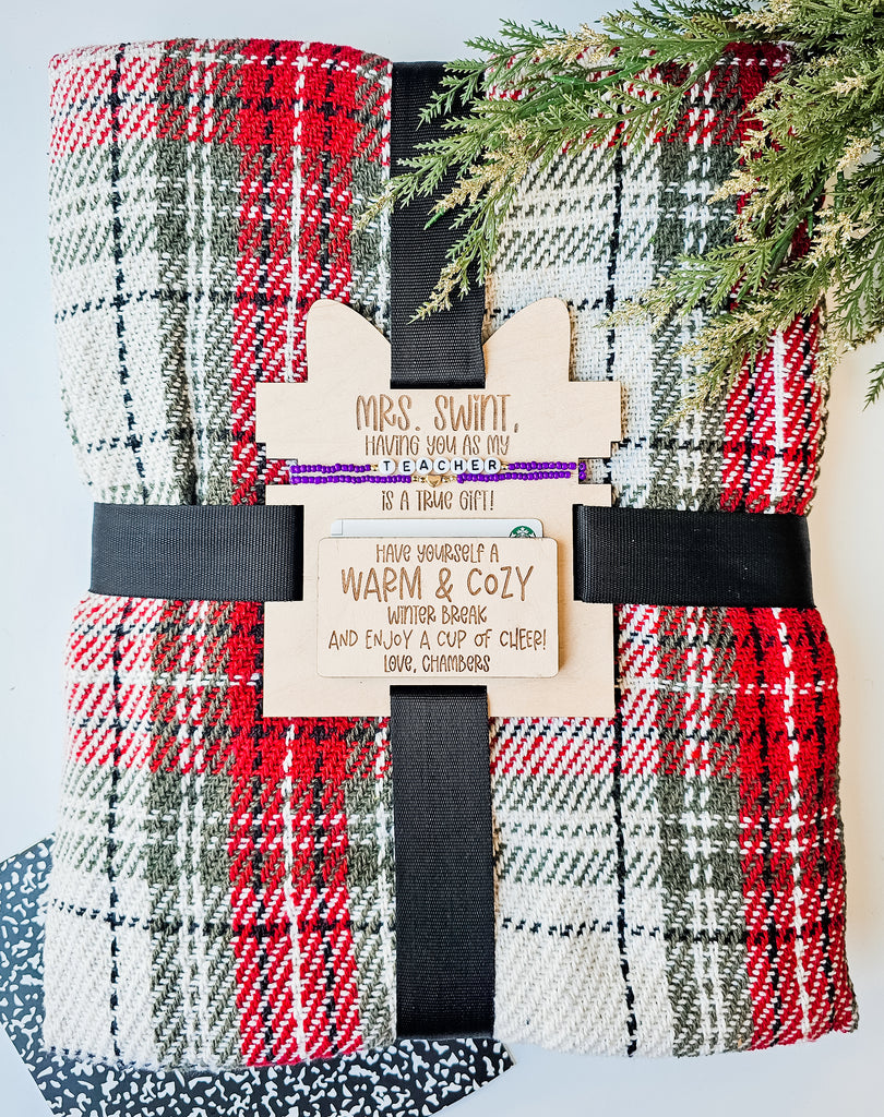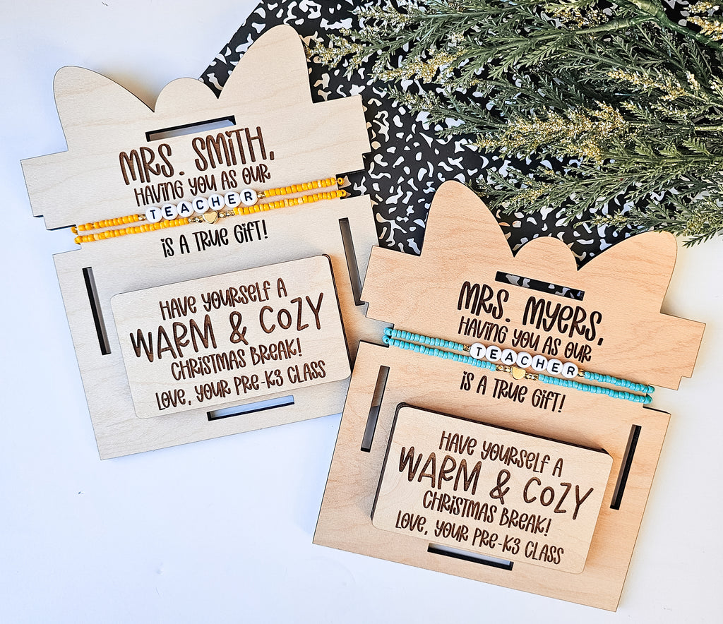 These one of a kind laser engraved and cut wooden blanket tags are the ultimate gift because it's also a gift card and bracelet holder!